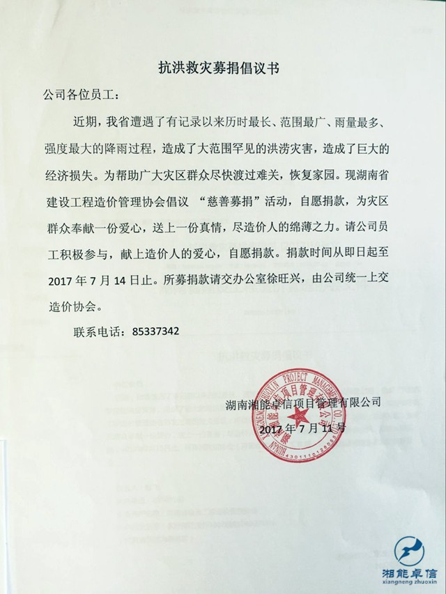 2017年7月10日湖南省建設(shè)工程造價(jià)管理協(xié)會(huì)組織開(kāi)展抗洪救災(zāi)“慈善募捐”活動(dòng)。我單位積極響應(yīng)發(fā)出倡議,募得捐款共:5470元,已如數(shù)上交湖南省工程造價(jià)管理協(xié)會(huì)。